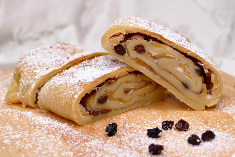Dann den Strudel vorsichtig zusammenrollen. Die Enden drückt ihr gut zusammen, sodass nichts rauslaufen kann. In eine gefettete Backform geben und bei 175 Grad Ober- und Unterhitze etwa 45-60min backen. Dabei öfters mit Butter bestreichen. Wenn der Strudel goldbraun ist, gebt ihr etwas Milch obendrüber und last ihn dann noch kurz im Backofen.