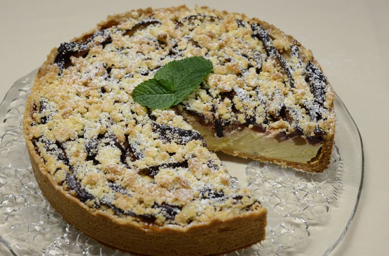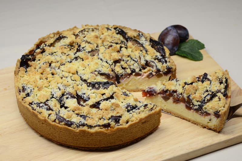 Den Teig aus dem Kühlschrank holen und dann die Quark-Creme drauf geben und die Pflaumen über den Kuchen verteilen. Die beiseitegestellte Streuselmasse über dem Kuchen verteilen.
