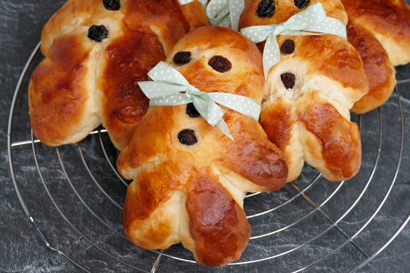 Im vorgeheizten Backofen bei 200 Grad Ober-/Unterhitze etwa 20 Minuten backen. Wenn sie goldgelb bis hellbraun sind und von unten hellbraun, dann sind die Weckmänner fertig.